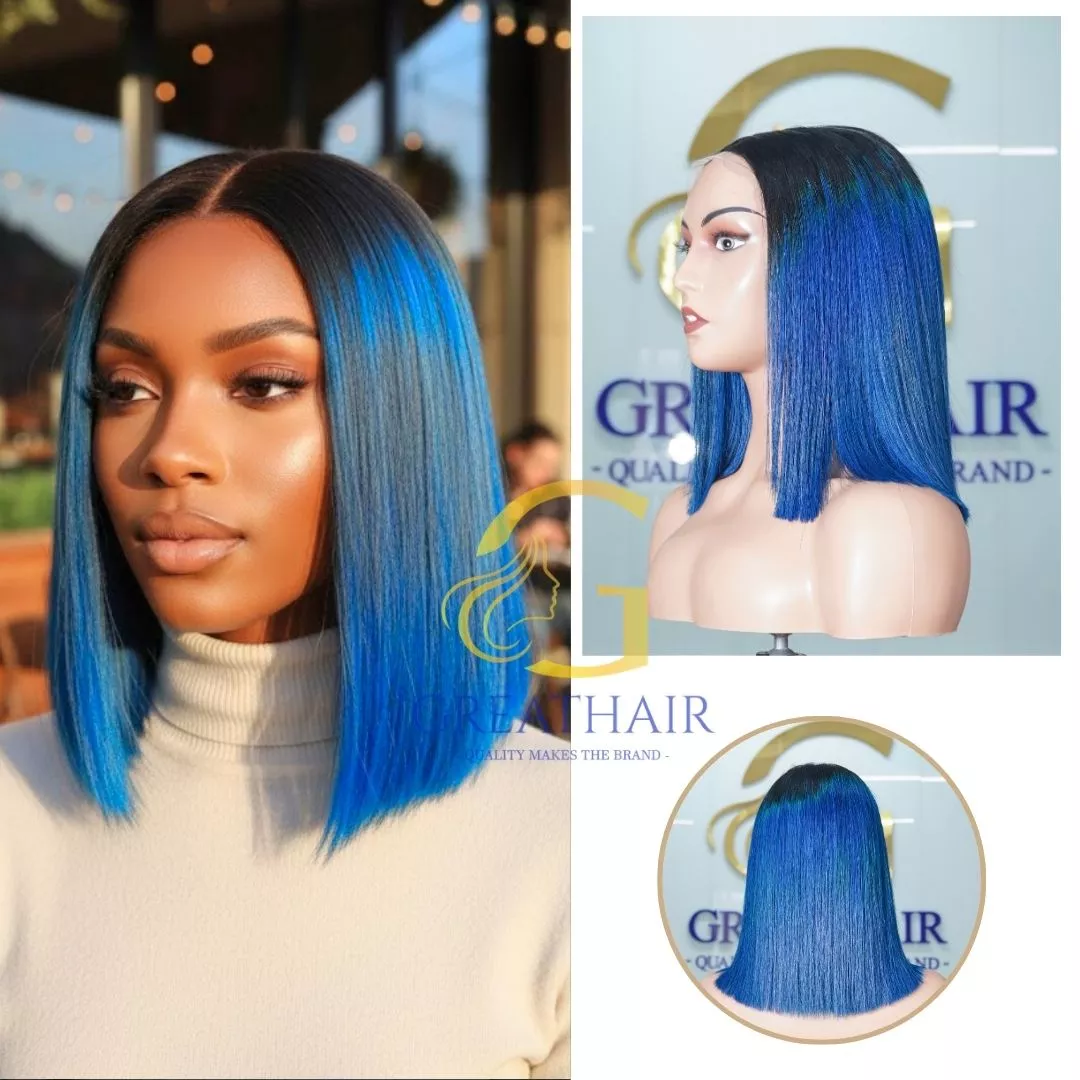 Our blue straight wig is made for buyers who want a bold color statement with a clean, wearable finish. This style suits salons, resellers, and personal buyers looking for a straight bob look with HD lace and an ombre dark root effect.
